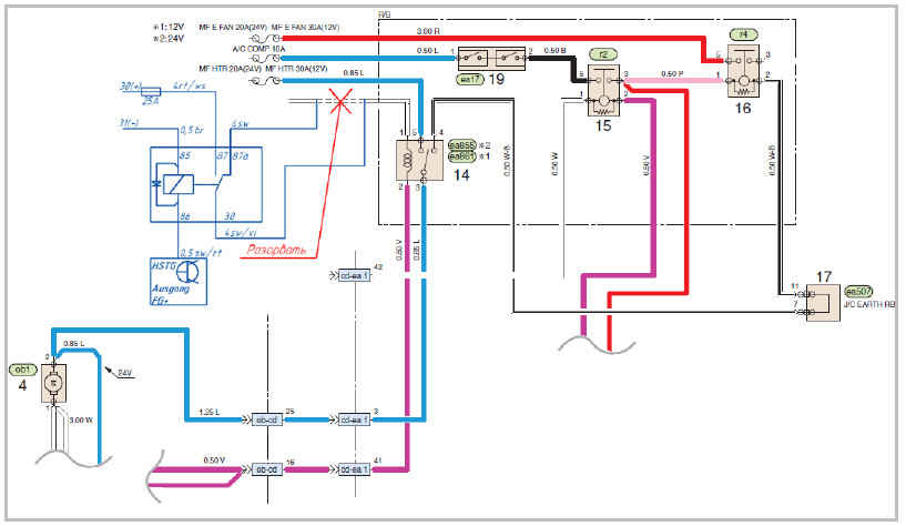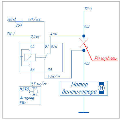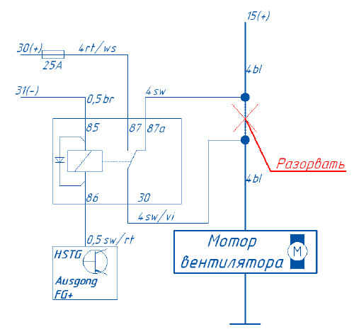Разорвать управляющий провод (белый) вентилятора и подключить к предпусковому подогревателю Hydronic согласно схеме