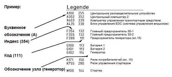 Условные обозначения (Legende) (L) расположены на каждой электрической схеме справа вверху и служат для обозначения деталей посредством букв и порядкового номера, а также для идентификации запчастей посредством кодового номера.