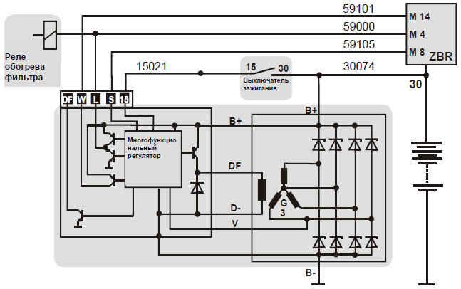 С переходом от первичного возбуждения к регулировке выход L на UАКБ включается и подключенные потребители (например, обогрев топливного (фильтра) включается.