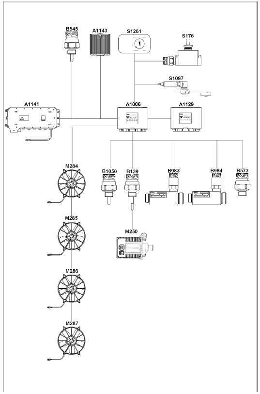 Блок управления EMU (A1006) получает данные от реле расхода (B983, B984) и управляет резервным насосом рулевого механизма (M235) с помощью резервного насоса рулевого механизма (K1159) и с помощью резервного насоса рулевого механизма с контакторами (Q117).