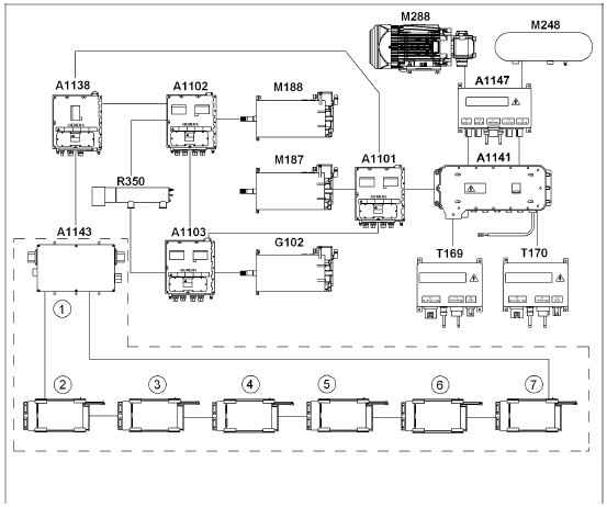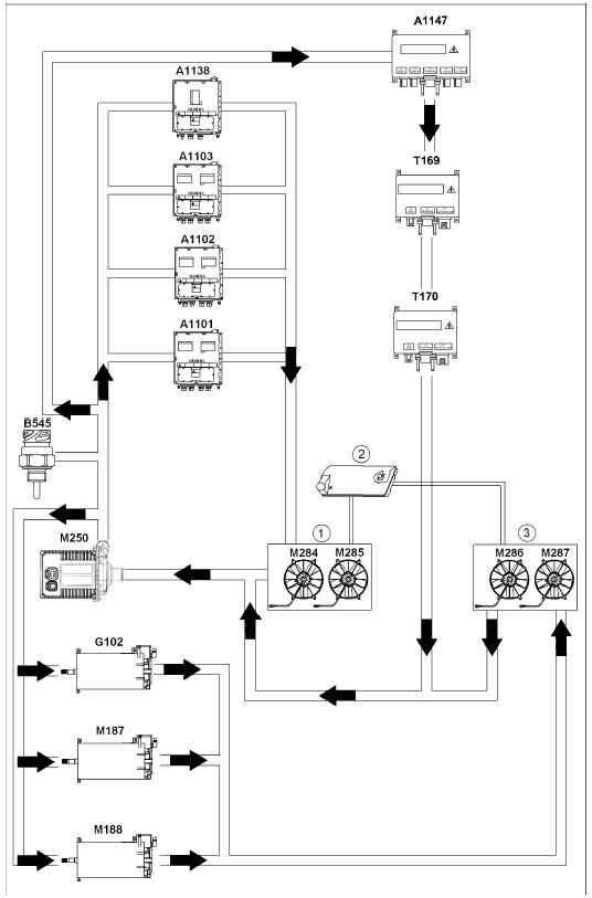 · Теплообменники (1, 3) с двигателями вентиляторов (M284, M285, M286, M287)