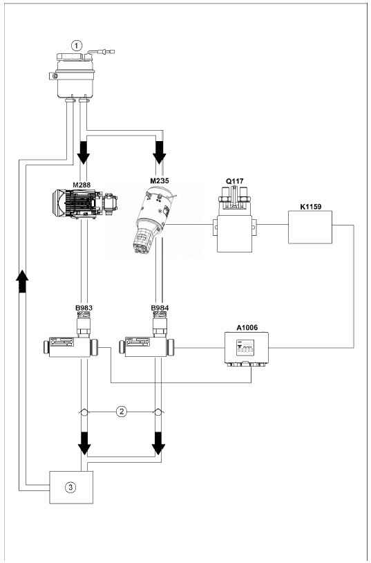 Электродвигатель насоса рулевого механизма с датчиком температуры (M288) или резервный насос рулевого механизма (M235) подают в гибридную систему рулевого механизма достаточное количество масла для рулевого механизма из дополнительного бачка для охлаждающей жидкости (1). Для контроля используется 2 реле расхода (B983, B984) в гидросистеме. 2 обратных клапана (2) отключают безнапорную линию. Таким образом (3) в рулевой механизм подается масло для рулевого механизма.