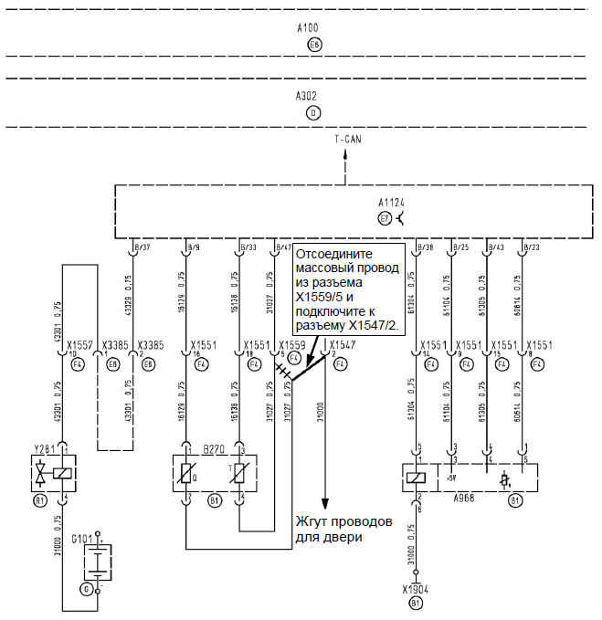 Если колебания индикации температуры масла превышают этот предел, измените подключение массовых проводов для датчиков уровня и температуры масла. Отсоедините провод 31027 от датчика уровня масла B270/2 на панели подключения кабелей к кабине X1559/5. Извлеките провод 31000 из гнезда разъемного соединения X1547/2 и удалите контакт. Соедините этот провод 31000 с помощью двойного прижимного контакта 07.91201-0224 с проводом 31027, который был подключен к датчику уровня масла B270/2, и снова вставьте в разъемное соединение X1547/2.