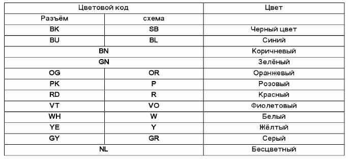 Ниже приведен список соответствия между буквенным кодом и цветом кабеля или разъемов, входящих в комплект.