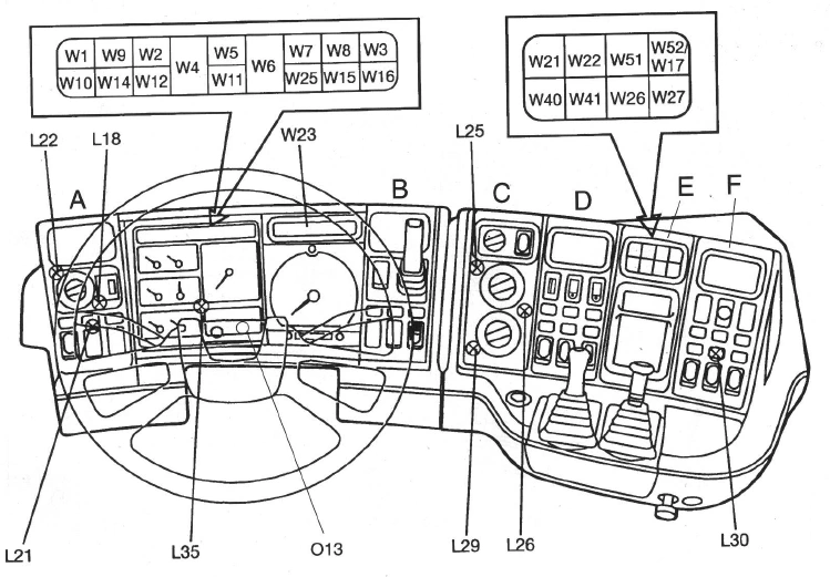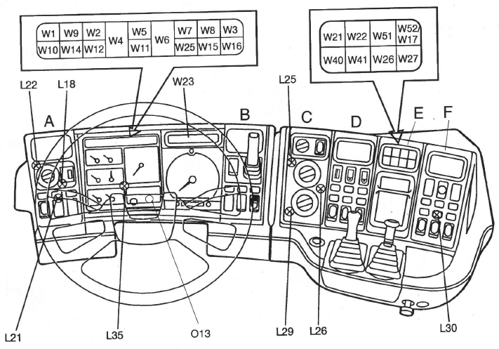 На чертеже представлена приборная панель для автомобиля с левосторонним рулевым управлением. На автомобилях с правосторонним рулевым управлением приборная панель располагается с правой стороны. Панели A – F имеют одинаковое расположение.