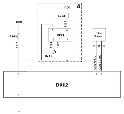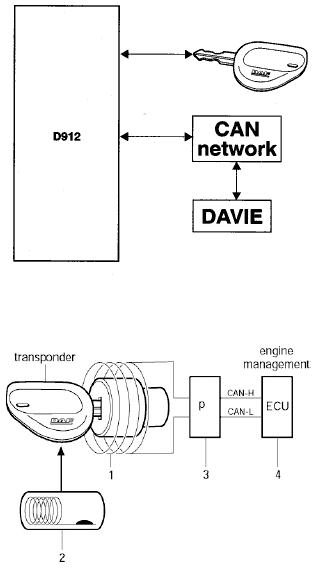 Иммобилайзер состоит из электронного блока (D912) и ключа зажигания, в который встроен «транспондер». Он связывается с блоком системы управления двигателем по сети бортового контроллера CAN. При помощи диагостического сканера Вы можете считать информацию о неисправностях в электронном блоке (D912) и запрограммировать блок.