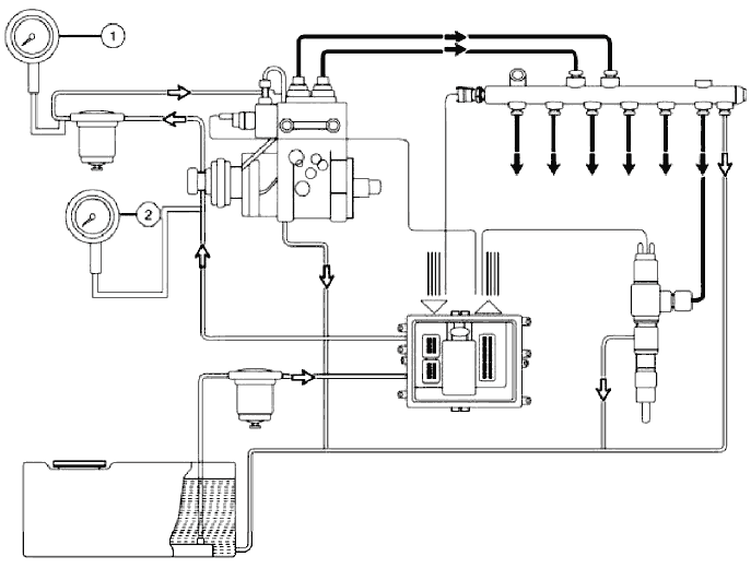 - Включите стартер и проследите за показаниями манометров. При исправном ТНВД давление на манометре ф должно быть больше, чем на манометре ф. В противном случае - неисправен ТНВД.