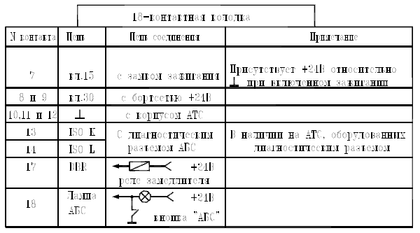 ВНИМАНИЕ: При отключенном блоке в 15-контактной колодке (указатель «ключ» на первом рис.) в ЭБК АДЮИ.453633.016 и 18контактной в ЭБК АДЮИ.453633.019 контакты 15 и 9, и контакты 18 и 12 замкнуты пружинной перемычкой внутри колодки. При этом лампа АБС при включенном зажигании горит. При установленном блоке пружинная перемычка размыкается. Однако имеются случаи ее неразмыкания (некачественная колодка). До замены колодки допускается удалить пружину путем выдергивания контакта 12 из колодки.