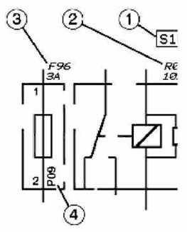 Причём предохранители просто назначаются буквенно-цифровым кодом и величиной допускаемой в них номинальной силы тока (поз. (3) здесь приведённой иллюстрации). Расположение предохранителя в электрической распределительной коробке назначав буквенно-цифровым кодом (поз. (4) здесь приведённой иллюстрации).