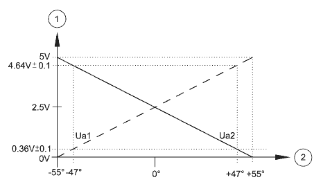 При движении переднего моста по прямому участку напряжение датчиков составляет 2,5 ±0,01 В. Значения напряжения двух датчиков имеют различное направление и контролируются с целью обеспечения избыточности.