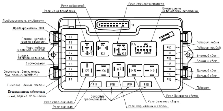 Схема расположения и назначение предохранителей и реле.