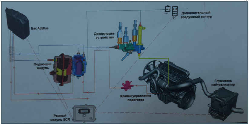 Схема взаимодействия компонентов в системе нейтрализации отработавших газов типа SCR