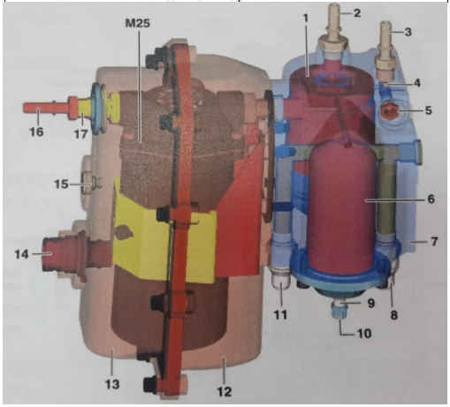 Подающий модуль AdBlue устанавливается на раме автомобиля и служит для подачи водного раствора мочевины под давлением (4,6…6 бар) из бака AdBlue к дозирующему модулю. Напряжение питания 24В.