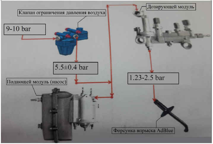 После запуска двигателя блок управления двигателем через рамный блок управления SCR включает электромагнитный клапан ограничения давления воздуха, затем сжатый воздух подается в систему через сам клапан ограничения воздуха. Ограничительный клапан понижает давление от 9-10 бар до 5,5±0,4 бар. Помимо этого сжатый воздух подводиться и к нагнетательному модулю, где под его воздействием закрывается разгрузочный клапан, препятствующий перетеканию AdBlue назад в бак. Возможные причины неисправности клапана отсутствие подачи питания по проводу W667.