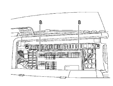 – Поднимите фиксирующие язычки бортового компьютера (В).