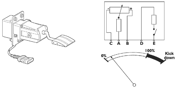 Функция Kick Down активируется только если сигнал потенциометрического датчика положения педали акселератора (1) достигнет 100%, причем этот момент не соответствует положению механического упора педали.