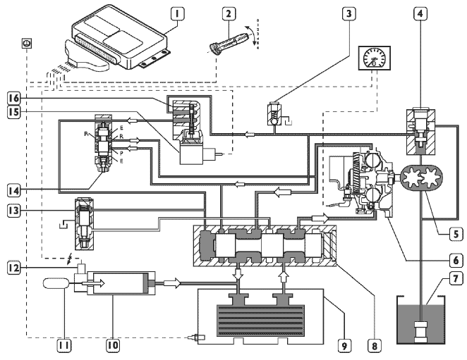 Система фиксирует воздействие водителя на переключатель (1), ЭБУ через SWI (интерфейс рулевого управления) получает и обрабатывает электрический сигнал и передает соответствующую команду на электроклапан (7) привода гидроаккумулятора масла и на пропорциональный электроклапан (5).