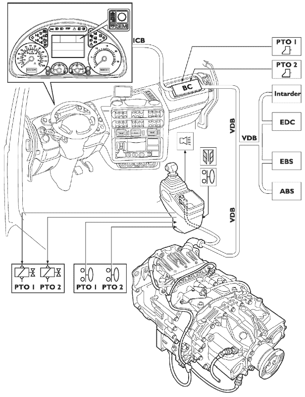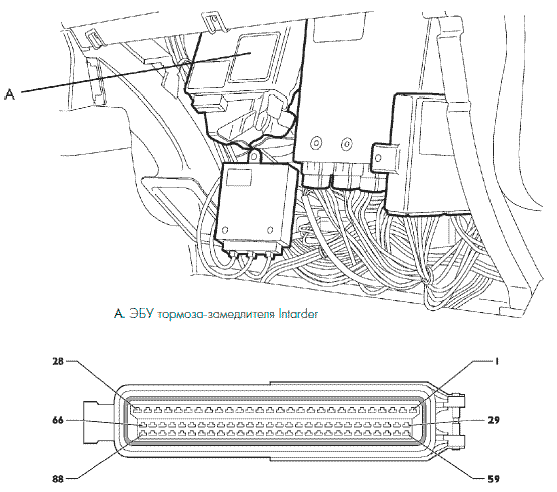 Блок связан с другими электронными системами автомобиля, такими как EDC, EBS, INTARDER и комбинацией приборов через линию СAN VDB (шину обмена данными электронных систем автомобиля).