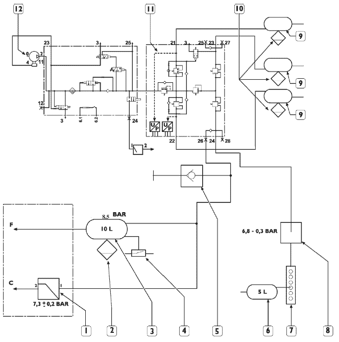 1. Редукционный клапан — 2. Клапан слива конденсата — 3. Воздушный ресивер 10 л — 4. Выключатель давления — 5. Штуцер для подключения манометра — 6. Воздушный ресивер 5 л — 7. Компонент распределителя давления — 8. Управляемый клапан давления — 9. Воздушный ресивер — 10. Клапан слива конденсата — 11. APU (блок подготовки воздуха) — 12. Компрессор.