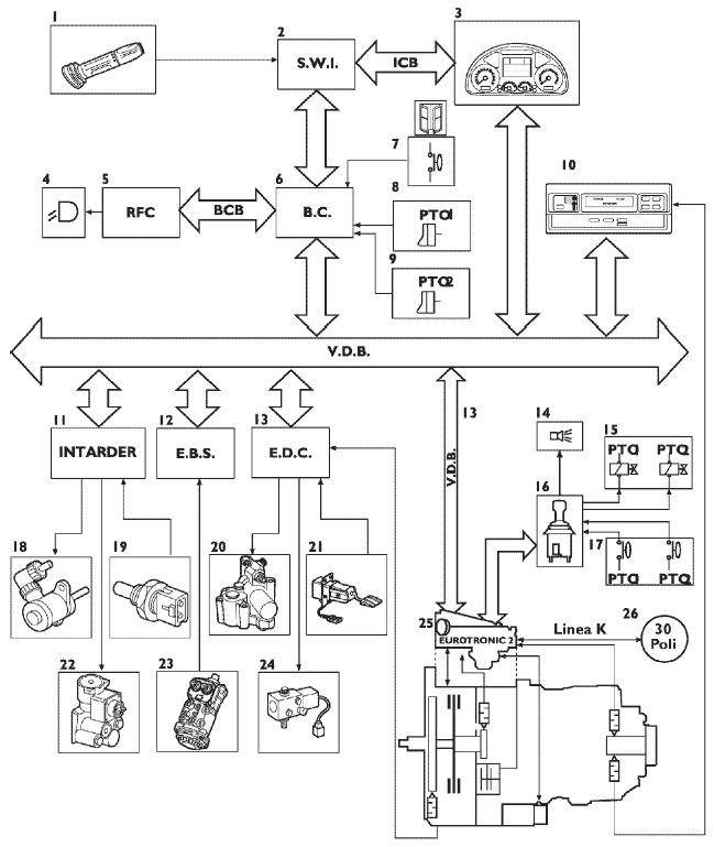 17. Выключатели контрольных ламп коробки отбора мощности — 18. Пропорциональный электроклапан — 19. Датчики температуры охлаждающей жидкости — 20. Электроклапан остановки двигателя — 21. Педаль акселератора — 22. Электроклапан ВКЛ./ОТКЛ. — 23. Дуплексный распределитель (педаль тормоза) — 24. Электроклапан турбокомпрессора с изменяемой геометрией (VGT) — 25. ЭБУ КП — 26. Диагностический разъем