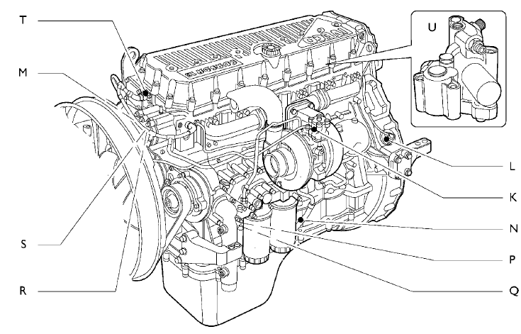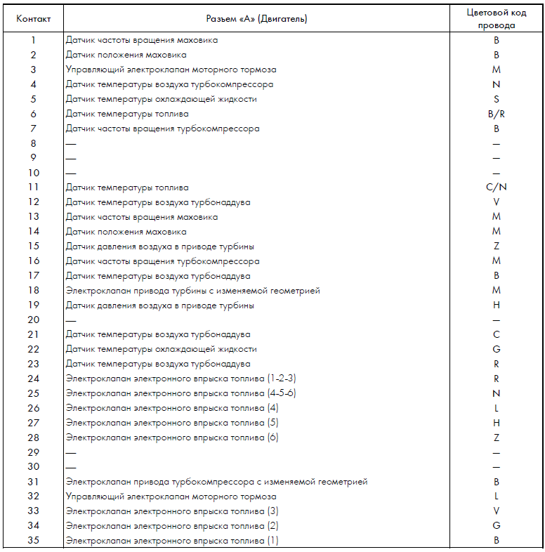 А. ДАТЧИК ЧАСТОТЫ ВРАЩЕНИЯ РАСПРЕДВАЛА — В. НАГРЕВАТЕЛЬНЫЙ ЭЛЕМЕНТ ПРЕДПУСКОВОГО ПОДОГРЕВА — С. ДАТЧИК ТЕМПЕРАТУРЫ ВОЗДУХА ВО ВПУСКНОМ КОЛЛЕКТОРЕ — D. ДАТЧИК ДАВЛЕНИЯ ТУРБОНАДДУВА — E. ГЕНЕРАТОР — F. ДАТЧИК УРОВНЯ МОТОРНОГО МАСЛА (ОПЦИЯ) — G. ЭБУ ДВИГАТЕЛЯ EDC (MS6) — H. ТОЧКА КРЕПЛЕНИЯ МАССОВОГО ПРОВОДА НА ДВИГАТЕЛЕ — I. СТАРТЕР — J. ДАТЧИК ТЕМПЕРАТУРЫ ТОПЛИВА — K. ДАТЧИК ЧАСТОТЫ ВРАЩЕНИЯ ТУРБИНЫ — L. ДАТЧИК ЧАСТОТЫ ВРАЩЕНИЯ МАХОВИКА — М. УПРАВЛЯЮЩИЙ ЭЛЕКТРОКЛАПАН ТУРБОКОМПРЕССОРА С ИЗМЕНЯЕМОЙ ГЕОМЕТРИЕЙ — N. ДАТЧИК ДАВЛЕНИЯ ВКЛЮЧЕНИЯ ТУРБОНАДДУВА — О. ВЫКЛЮЧАТЕЛЬ КОНТРОЛЬНОЙ ЛАМПЫ ЗАСОРЕНИЯ ТОПЛИВНОГО ФИЛЬТРА — P. ДАТЧИК НИЗКОГО ДАВЛЕНИЯ МАСЛА — Q. ДАТЧИК ДАВЛЕНИЯ МАСЛА — R. ДАТЧИК ТЕМПЕРАТУРЫ ОХЛАЖДАЮЩЕЙ ЖИДКОСТИ ДЛЯ EDC — S. ДАТЧИК ТЕМПЕРАТУРЫ ОХЛАЖДАЮЩЕЙ ЖИДКОСТИ — T. РАЗЪЕМ