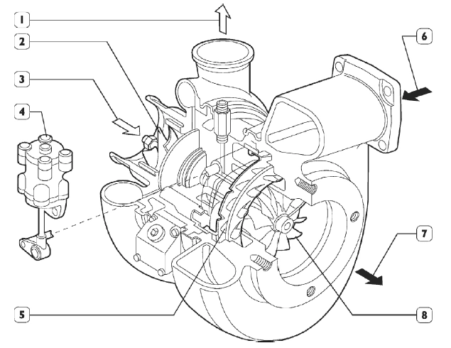 1. Нагнетание воздуха во впускной коллектор — 2. Компрессор — 3. Вход воздуха — 4. Привод устройства изменения проходного сечения турбокомпрессора — 5. Регулировочное кольцо входного канала для отработавших газов — 6. Подача отработавших газов — 7. Выход отработавших газов — 8. Турбина