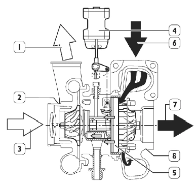 1. Нагнетание воздуха во впускной коллектор — 2. Компрессор — 3. Вход воздуха — 4. Привод устройства изменения проходного сечения турбокомпрессора — 5. Регулировка скорости потока отработавших газов — 6. Подача отработавших газов — 7. Выход отработавших газов — 8. Турбина