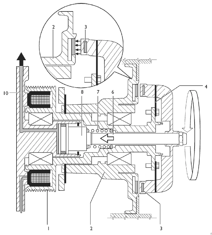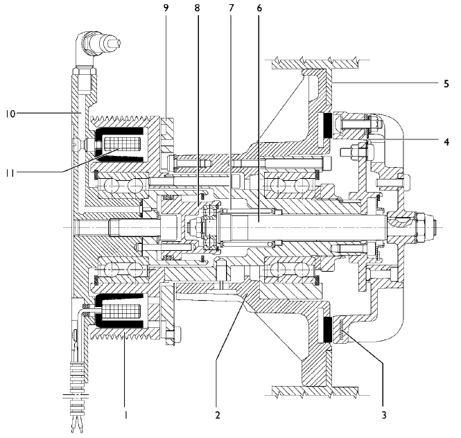 1. Шкив — 2. Втулка крыльчатки — 3. Постоянные магниты — 4. Металлические пластинки — 5. Крыльчатка — 6. Вал — 7. Возвратная пружина — 8. Поршень — 9. Плавающее кольцо — 10. Канал подвода сжатого воздуха — 11. Катушка