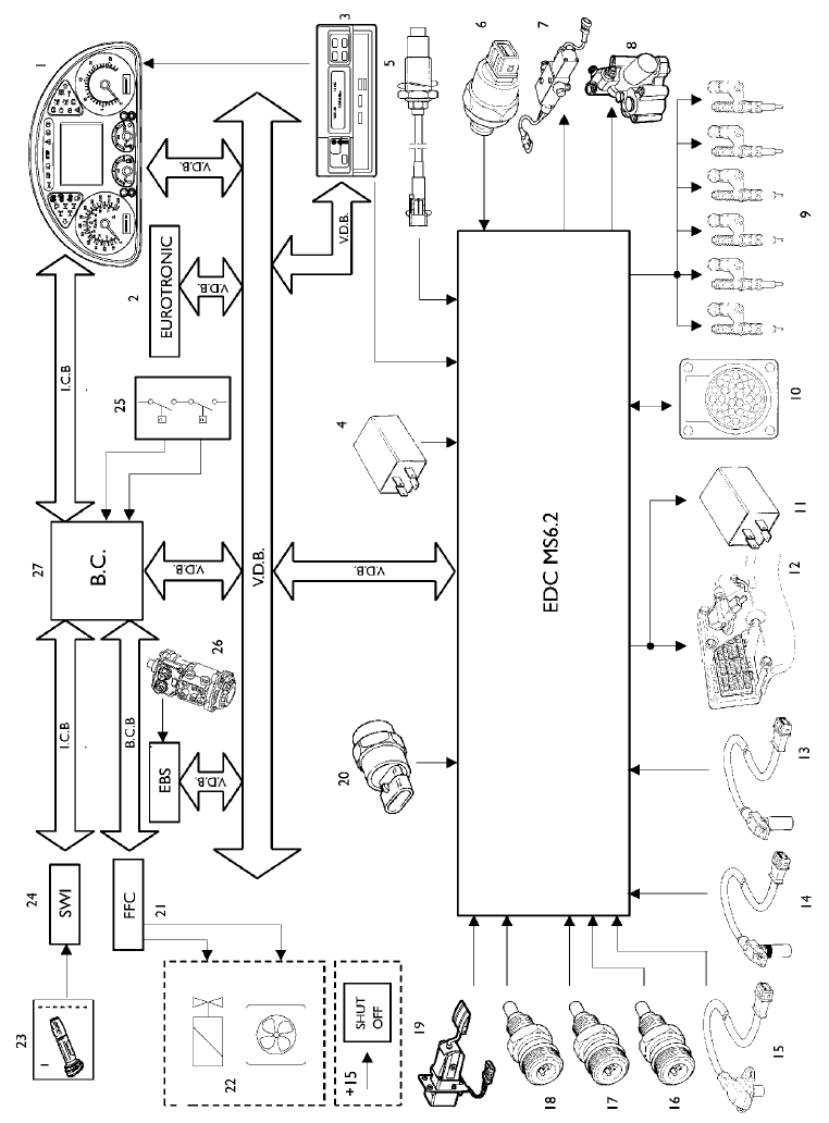 1. Рычажок моторного тормоза — 2. ЭБУ SWI (интерфейса рулевой колонки) — 3. Комбинация приборов — 4. Бортовой компьютер — 5. ЭБУ двигателя (EDC) — 6. ЭБУ EBS — 7. ЭБУ КП Eurotronic — 8. Электроклапан моторного тормоза — 9. Привод устройства изменения проходного сечения турбины — 10. Насос—форсунки — 11. Педаль тормоза — 12. Рычаг переключения передач.