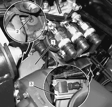 - 1: Штекерное соединение датчика уровня масла В14 (возле щупа-указателя уровня масла)