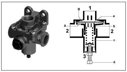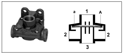 Питающая магистраль, идущая от воздушного баллона, подключается к выводу 1 таким образом, что подаваемый сжатый воздух проходит в рабочую магистраль через камеру А и вывод 2. Выполненный в