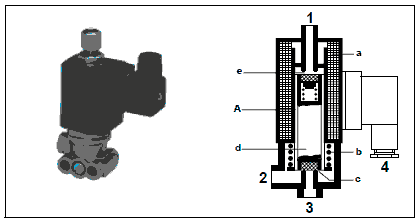После отключения подачи тока на катушку магнита (а) пружина сжатия (b) перемещает сердечник (d) обратно в исходное положение. При этом выпускное отверстие (с) закрывается, впускное (е) -