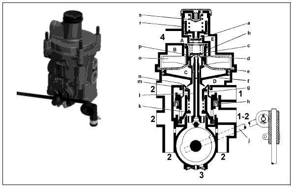 Как только сила , действующая в камере С на нижнюю поверхность диафрагмы, станет равна силе, действующей на поршень (b), он переместится вверх. Впускное отверстие (v) закроется, создавая