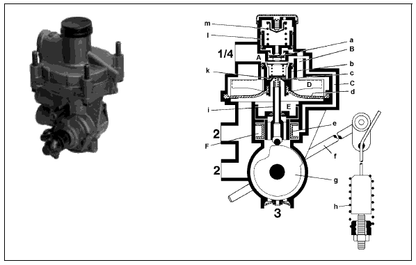 При срабатывании тормозной системы сжатый воздух через вывод 4 проходит в камеру А и перемещает поршень (а) вниз. При этом выпускное отверстие (с) закрывается, а впускное (b) - открывается. Теперь сжатый воздух на выводе 1 проходит в камеру В и через выводы 2 - к подключенным тормозным цилиндрам.