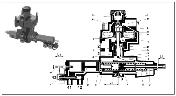Регулятор тормозных сил закреплен на раме автомобиля с выпуском 3, смотрящим вниз. Выводы 41 и 42 соединяются с пневматическими баллонами правой и левой сторон автомобиля. Давление воздуха (управляющее давление) от пневматических баллонов воздействует на поршни (m и k). В зависимости от давления воздуха (оно соответствует состоянию загрузки) направляющая втулка (i) с расположенным на нем управляющим кулачком (h) смещается под воздействием пружины (z) и настраивается в положение регулировки, соответствующее состоянию загрузки.