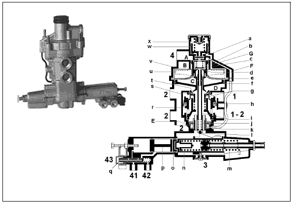 на выводе 1-2, поршень (r) перемещается вверх и клапан (g) закрывает выпускное отверстие (t). При дальнейшем перемещении вверх поршень (r) приподнимается с клапана (g), открывая впускное отверстие (s). Теперь полное давление ресивера через выводы 2 попадает к тормозным цилиндрам.