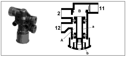 При сцеплении полуприцепа с тягачом питающий сжатый воздух проходит через вывод 11 в камеру В. Если поршень (а) все еще находится в положении «заторможено», то под воздействием давления