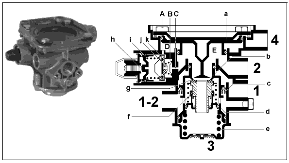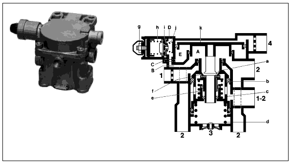 клапан (f), закрывает выпускное отверстие (b) и открывает впускное (g). Сжатый воздух из ресивера прицепа (выводы 1-2) проходит теперь через выводы 2 к подключенным за ними тормозным кранам, а также по каналу А в камеру С, создавая усилие на клапане (k).