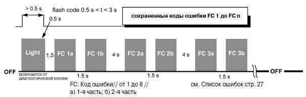 Стирание ошибок подтверждается 8 быстрыми миганиями контрольной лампы и далее выдается системный код.