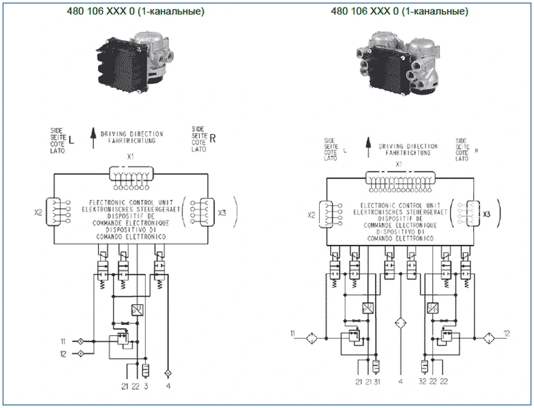 Новая конструкция одноканальной версии предназначена для передних и задних осей. В двухканальной версии модулятор оси используется для задних осей. Модулятор оси в различных исполнениях контролирует давление в исполнительных механизмах тормозов с обеих сторон одиночной или двойной оси: на передней оси в виде одноканальной версии, а на Задних осях в виде одно- и двухканальной версии. В нем предусмотрен один или два независимых пневматических канала регулирования давления (два канала для правосторонней и левосторонней ориентации грузовиков), каждый из которых содержит работающий в импульсном режиме впускной и выпускной управляющий клапан плюс один