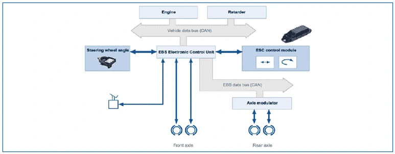 блок ECU системы EBS, анализирующий сигналы датчиков угла поворота рулевого колеса и управляющий различными функциями системы ESC для обнаружения неисправностей и в целях диагностики;
