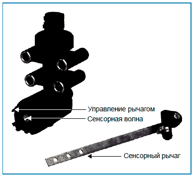Датчик хода прочно соединен с регулируемой осью благодаря рычажной системе. На его конце находятся наконечники из резины для амортизации и компенсации.