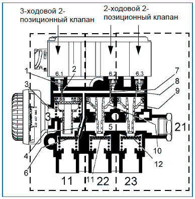 Порядок работы 3-ходовых 3-позиционных клапанов (рис. выше) таков: