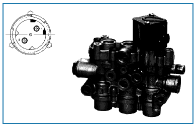 Клапан ПО находится рядом с передней осью и управляет работой пневмоподушек передней оси. Он оснащен, как правило, 2-ход. 2-позиц. клапаном для передней оси (управляемая ось) и может, таким образом, осуществлять только функцию открывания/перекрывания.