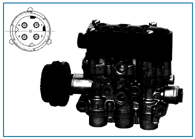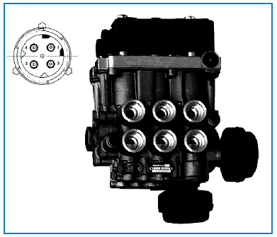 Клапан зад./под.оси - это центральный клапан системы с автоматической подъемной осью, он находится в области задней оси. Он управляет пневмоподушками движущей оси в ТС с частично и полностью пневматической подвеской, а также подъемным сильфоном и пневмоподушками подъемной оси. В системах, обладающих регулированием соотношения давления / оптимальным регулированием силы тяги, за счет электромагнитного клапана ECAS можно привести в действие ТС с полностью пневматической подвеской (т. е. также и пневмоподушки передней оси).