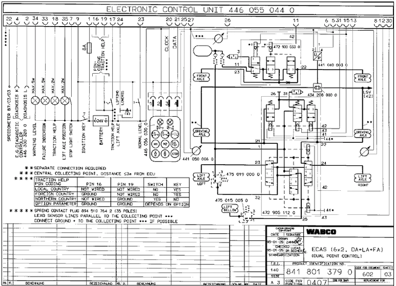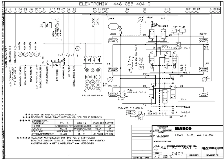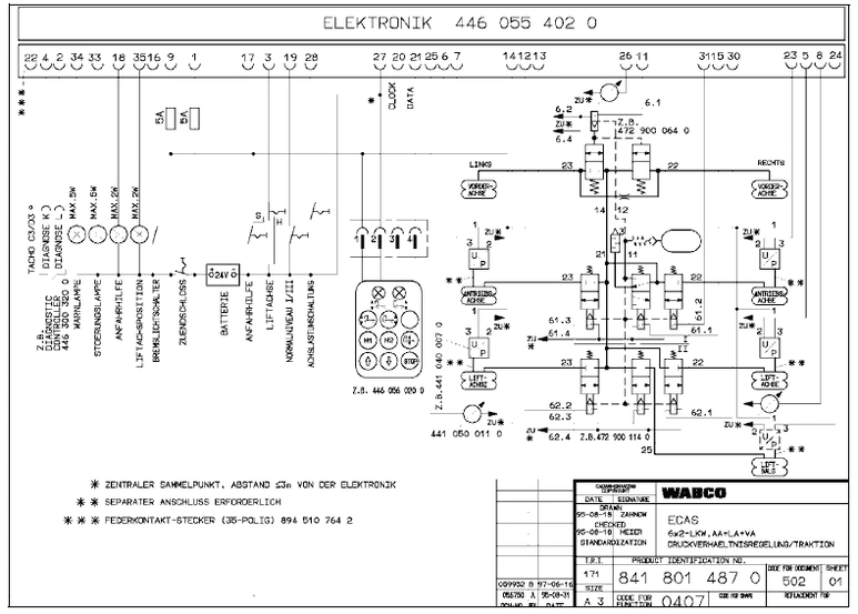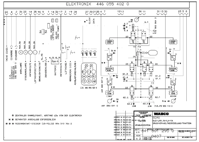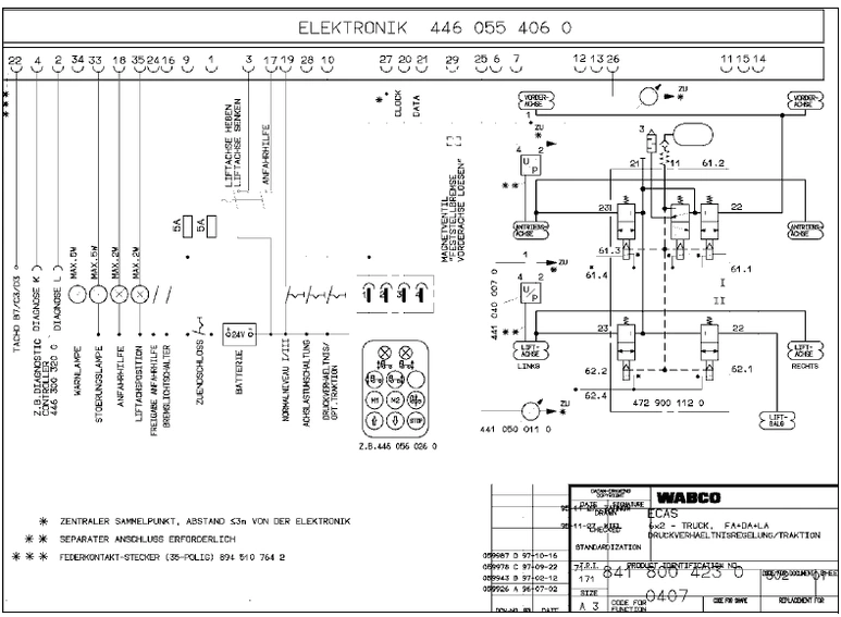 В ТС 6х2 происходит регулировка давления между движущей и неведомой осью (напр ., подъемная ось) в зависимости от исполнения системы при оптимальной тяге (ECU 446 055 005) или при параметрированном соотношении давления (ECU 446 055 009). Для этого необходимо установление датчиков давления на пневмоподушках ведущей оси, а не на пневмоподушках неведомой задней оси.