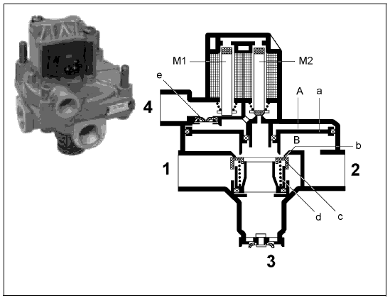 Если на выводе 4 создается управляющее давление (например, 1 бар), то оно проходит через магниты (М1 и М2) в верхнюю камеру поршня А и прижимает поршень (а) вниз. В седле (b) открывается узкая щель и сжатый воздух от вывода 1 проходит в камеру В. На выводе 2 и соответственно в тормозных цилиндрах повышается давление. Так как верхняя и нижняя стороны поршня (а) имеют одинаковые активные поверхности, поршень (как только давление на выводе 2 станет равно давлению на выводе 4) встанет в первоначальное положение. Кольцевой поршень (с) снова прилегает к седлу (b) и проход от вывода 1 в камеру В перекрывается.