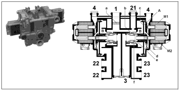 Между камерами А и В устанавливается равновесие давлений. Кольцевой поршень (f) за счет усилия пружины (b) снова прилегает к седлу (e). Сжатый воздух не может проходить ни от вывода 1 к выводам 22, 23, ни от выводов 22, 23 к выводу 3 (в атмосферу).
