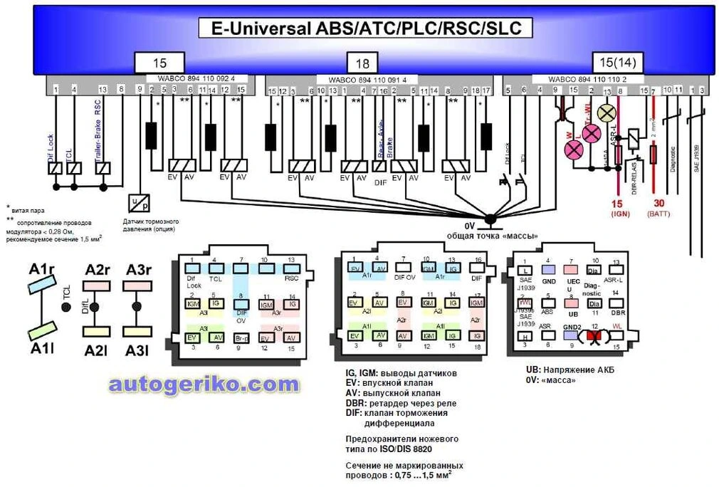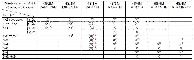На одну ось ТС могут приходиться максимум 2 колесных датчика и 2 модулятора давления, а максимальная конфигурация системы в целом может составлять 6 колесных датчиков (Sensors) и 6 модуляторов давления (Modulators) - 6S/6M.