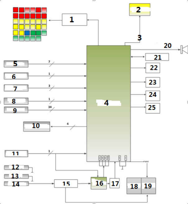 1. Аварийный сигнальный огонь шильдика , 2. Дисплей STFT, 3, DC, 4. Комбинированный прибор, 5. Вход аналоговой величины, 6. Сигнал частотного входа, 7. Сигнал частотного выхода, 8. Связь CAN, 9. Дискретный выход, 10. Выход питания датчика, 11. Вход пробуждения аппаратного обеспечения, 12. Заземление датчика, 13. Заземление питания, 14. Питание аккумулятора+, 15. Трубопроводная система питания, 16. Питание SV, 17. RESET, 18. Подсветка шильдика, 19. Подсветка указателя, 20. Зуммер, 21. Память, 22. Тахометр, 23. Спидометр, 24. Указатель температуры воды, 25. Указатель уровня топлива